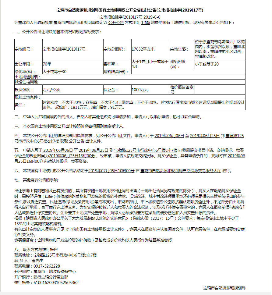 宝鸡市自然资源和规划局国有土地使用权公开公告出让公告(宝市招拍挂字[2019]17号)