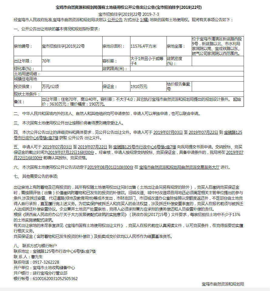 宝鸡市自然资源和规划局国有土地使用权公开公告出让公告(宝市招拍挂字[2019]22号)