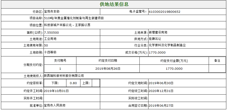 宝鸡市本级:项目名称: 510吨/年贵金属催化剂制备与再生新建项目