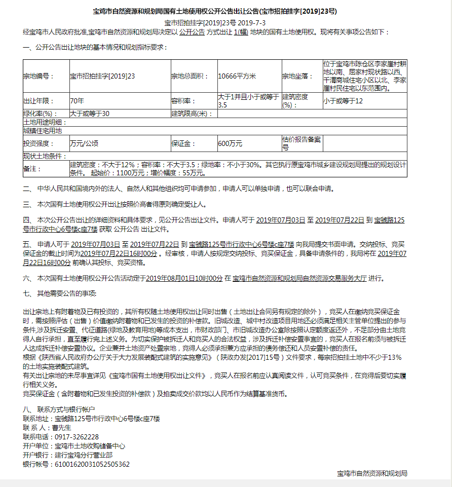 宝鸡市自然资源和规划局国有土地使用权公开公告出让公告(宝市招拍挂字[2019]23号)