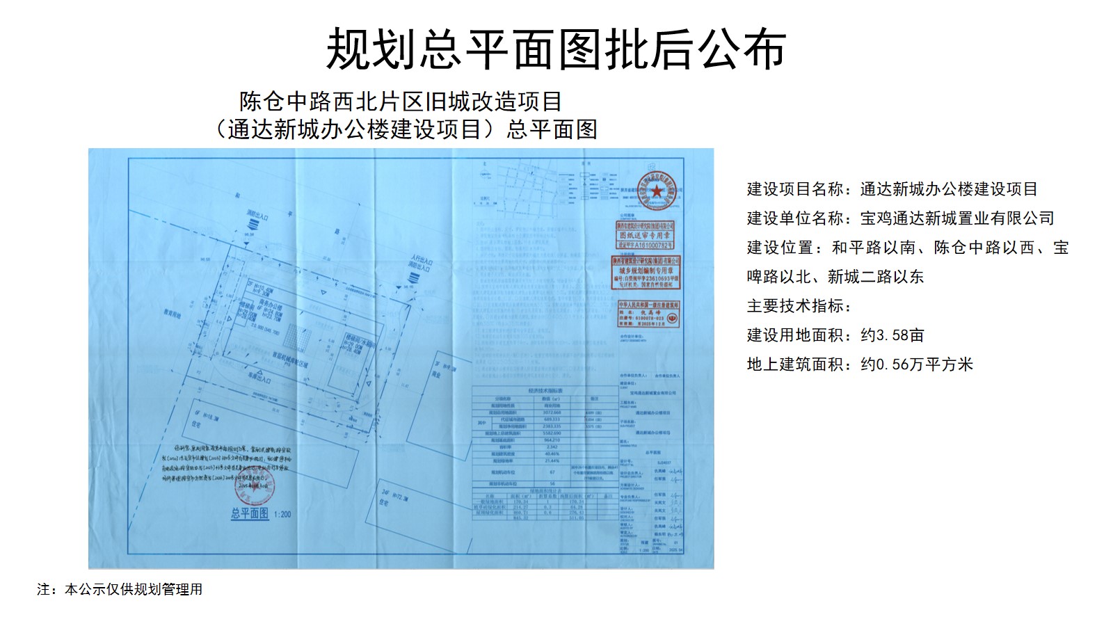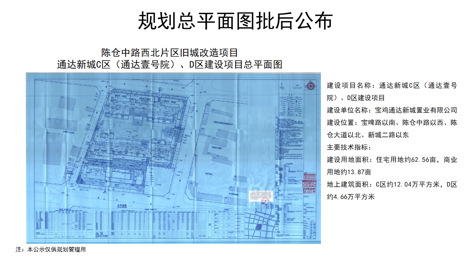 陈仓中路西北片区旧城改造项目(通达新城)位于陈仓大道以北、陈仓中路以西、新城二路以东、和平路以南,建设用地约80亩。项目分两个地块,其中地块一为通达新城办公楼项目,商业用地面积约3.58亩,地上建筑面积约0.56万平方米;地块二C区为通达壹号院项目,住宅用地面积约62.56亩,地上建筑面积约12.04万平方米;D区为商业区,商业用地面积约13.87亩,地上建筑面积约4.66万平方米。为保证规划的公开、透明,根据有关规定,现对该规划总平面图予以批后公布。