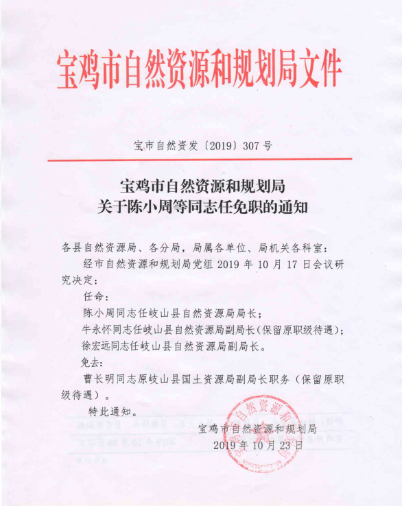 宝鸡市自然资源和规划局关于陈小周等同志任免职的通知
