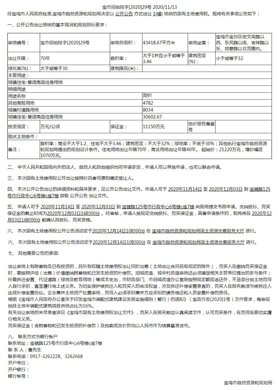 宝鸡市自然资源和规划局国有土地使用权公开公告出让公告(宝市招拍挂字[2020]29号)