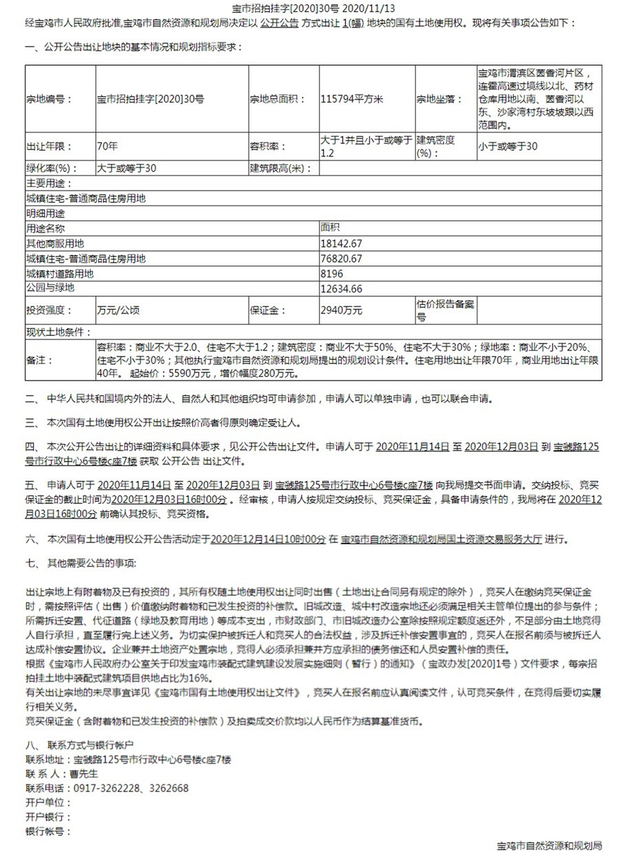 宝鸡市自然资源和规划局国有土地使用权公开公告出让公告(宝市招拍挂字[2020]30号)
