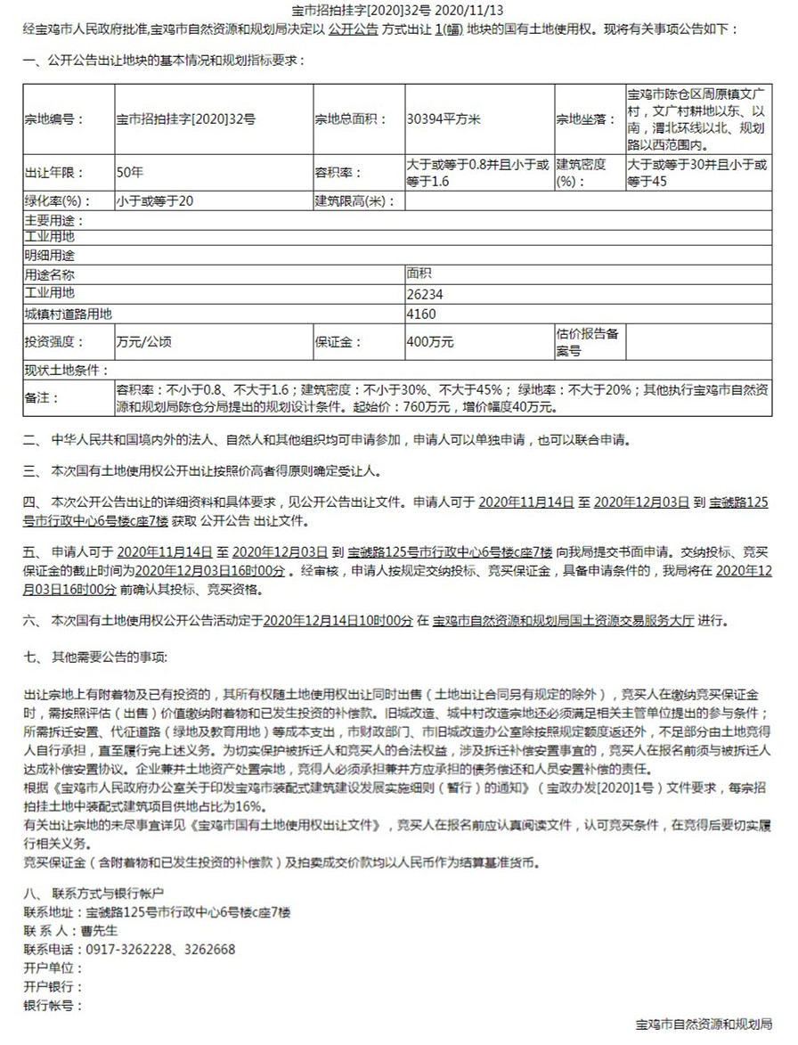 宝鸡市自然资源和规划局国有土地使用权公开公告出让公告(宝市招拍挂字[2020]32号)