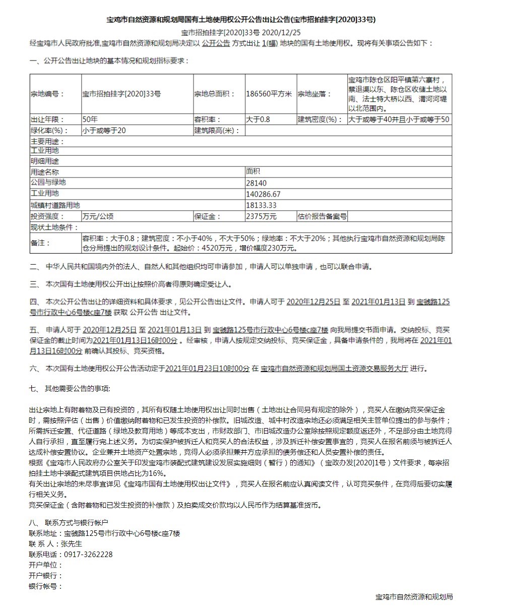 宝鸡市自然资源和规划局国有土地使用权公开公告出让公告(宝市招拍挂字[2020]33号)