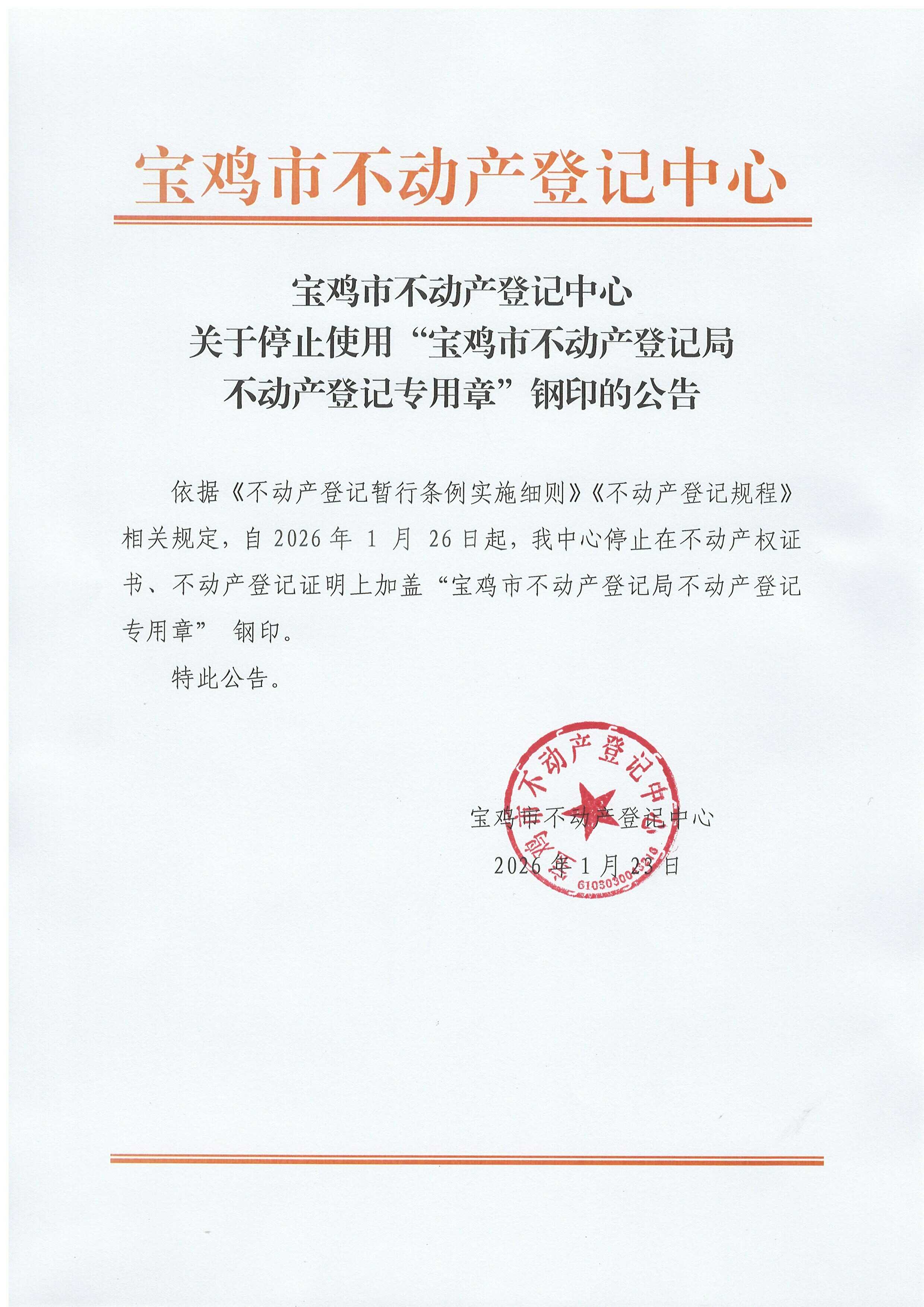 宝鸡市不动产登记中心关于停止使用“宝鸡市不动产登记局不动产登记专用章”钢印的公告