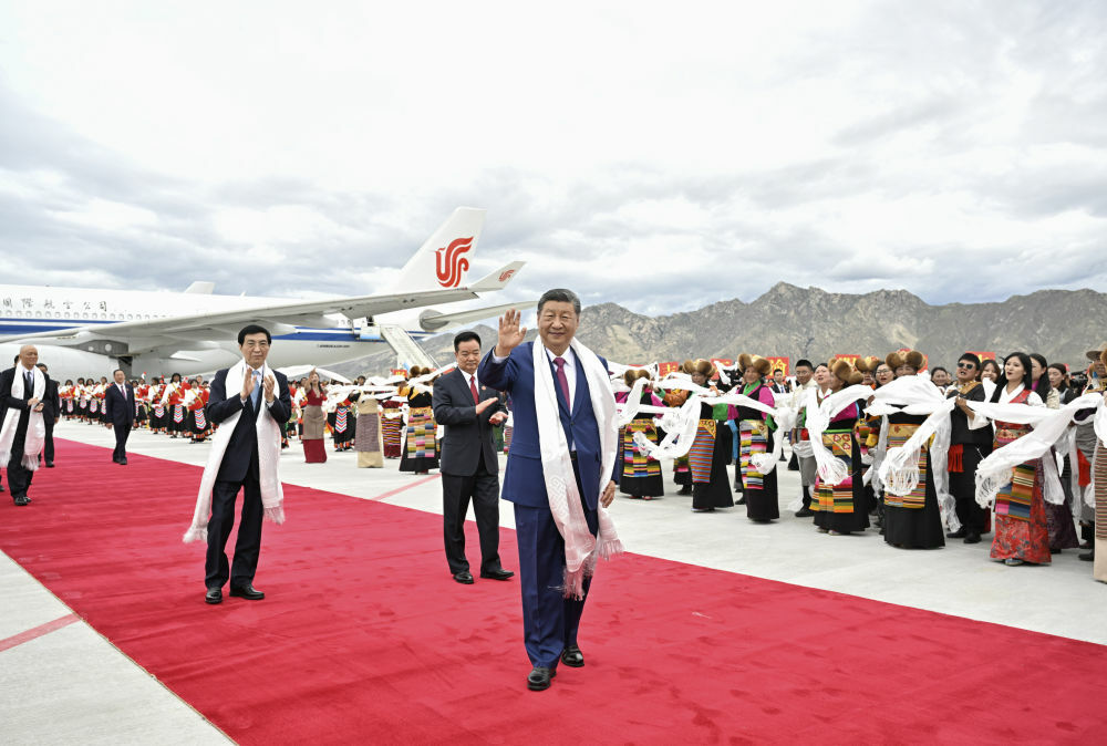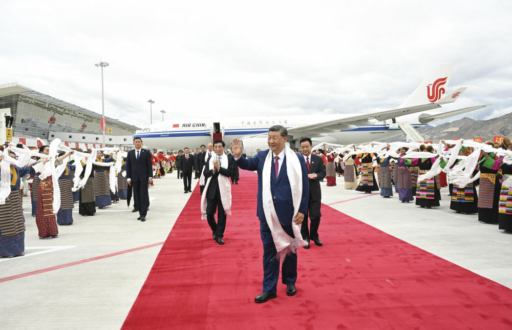 西藏自治区党委书记王君正、自治区人大常委会主任严金海、自治区人民政府主席嘎玛泽登、自治区政协党组书记刘江等在舷梯下迎候。习近平走下舷梯时,王君正敬献哈达,礼仪人员敬献切玛和青稞酒。各族群众代表身着节日盛装,挥动红旗和五彩花束,跳起欢快的民族舞蹈,欢迎总书记的到来,表达对总书记的衷心祝福。