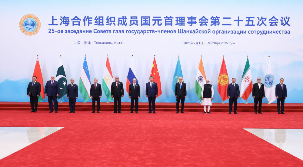 9月1日上午,上海合作组织成员国元首理事会第二十五次会议在天津梅江会展中心举行。中国国家主席习近平主持会议并发表题为《牢记初心使命 开创美好未来》的重要讲话。这是习近平同出席会议的上海合作组织成员国领导人、常设机构负责人集体合影。新华社记者 黄敬文 摄